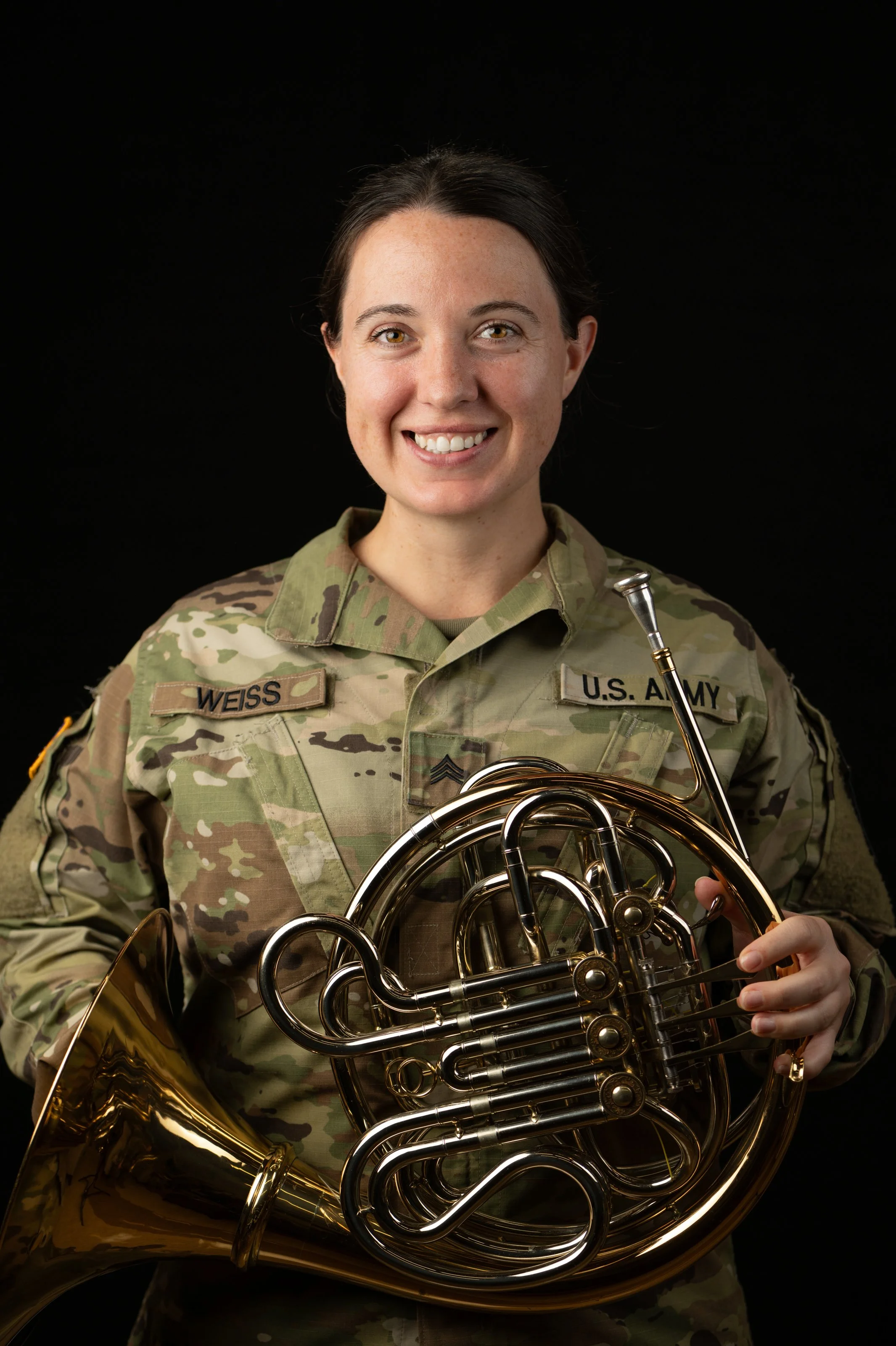 Sergeant Jessica Weiss enlisted in 2013 as a 27D Paralegal with the U.S. Army Reserve, serving in the 176th Medical Brigade in Seagoville, TX, until 2020. In 2021, she re-enlisted into the Texas Army National Guard with the 36th Infantry Division Band at Camp Mabry, where she now serves primarily on French horn and secondarily on trumpet. She spent three years performing in the R&B band before joining the brass quintet.